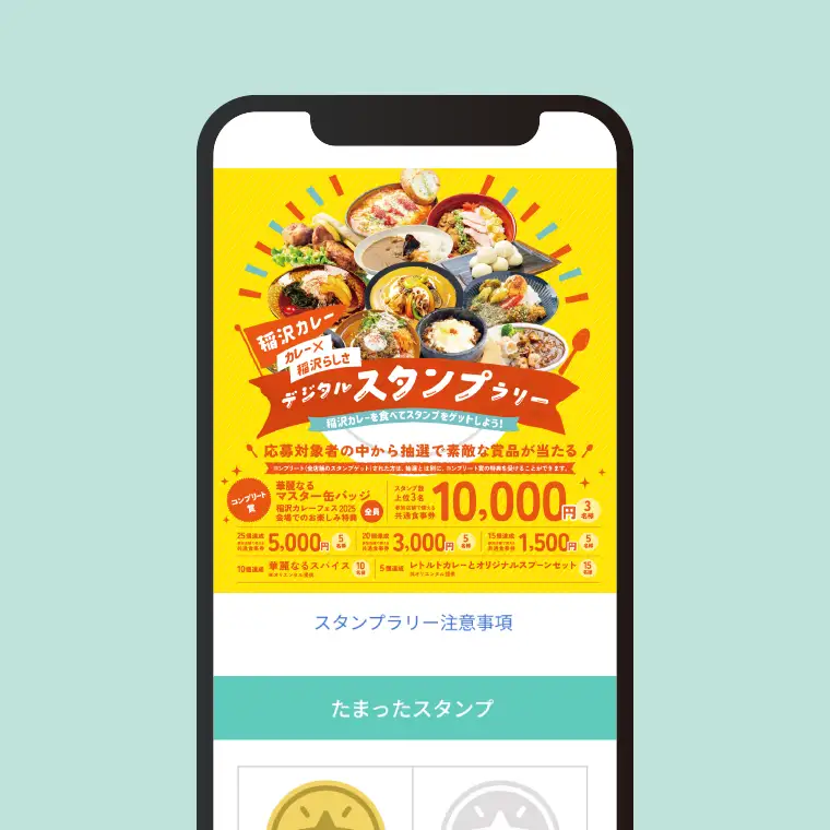 期間中は、各飲食店が「稲沢らしさ」を取り入れた多彩なカレーメニューを提供。来店者が対象メニューを注文すると、デジタルスタンプが付与される仕組みとしました。その結果、400名を超える方にご参加いただき、市内の回遊性向上や飲食店の利用促進など、地域活性化につながるイベントとなりました。
