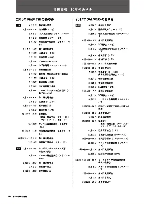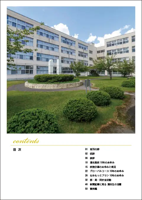 学校の様子をカラー写真で伝えるグラビアページにくわえ、過去の歴史から現況までを1冊の記念誌としてまとめました。